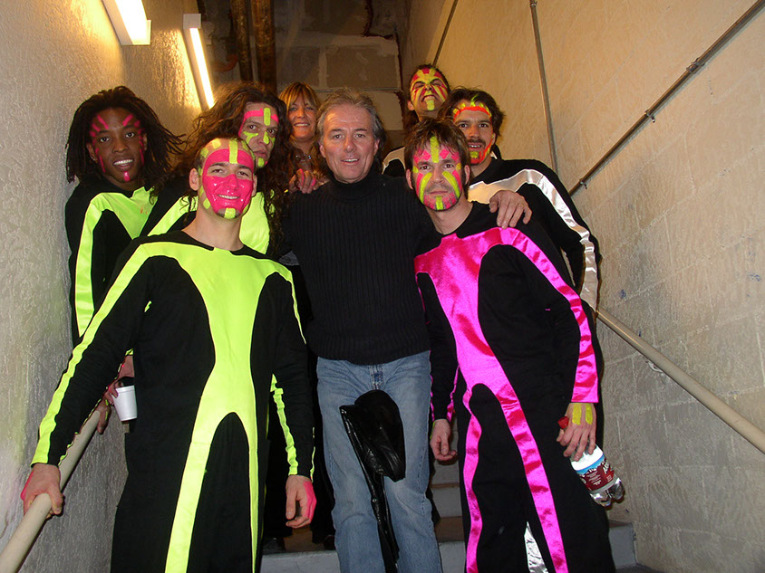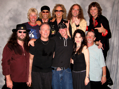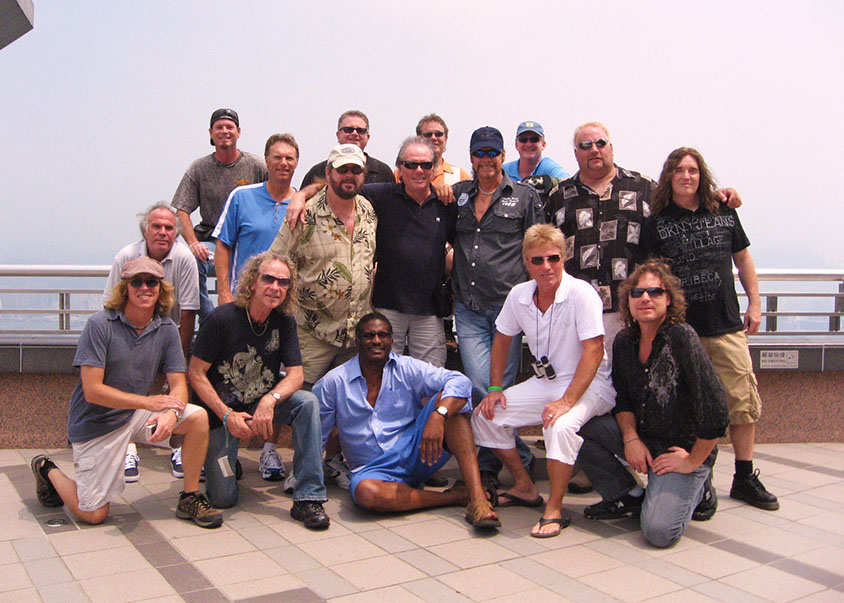 Aynsley on the road with the World Classic Rockers - the band and crew - Fergie Frederiksen (RIP) in white