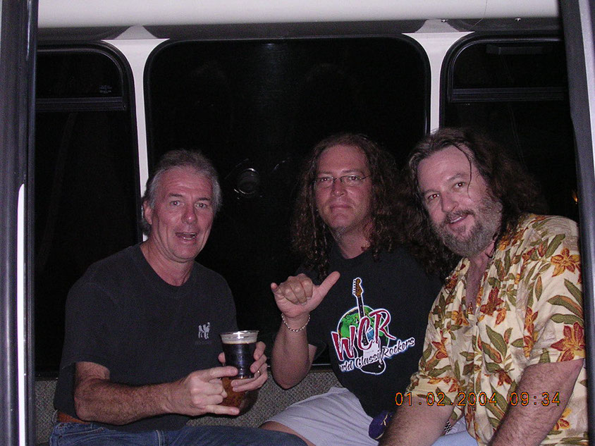 Aynsley on the road with the World Classic Rockers - the band and crew - Fergie Frederiksen (RIP) in white
